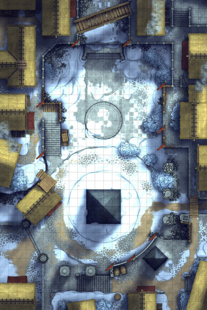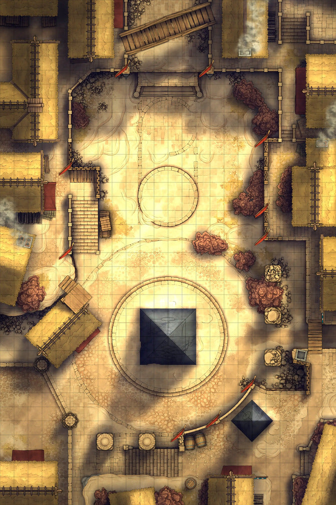 A village built atop ancient ruins! Nobody’s dared open the vault that sits in the village square … and your players might have to have a few fights to keep it that way — or to avert it!