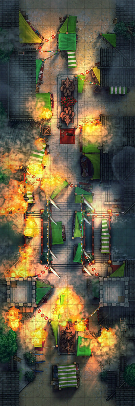 A vibrant Asian city market buzzing with hawkers & pick-pockets, hiding your players’ next fight! Toss your opponents off the bridge or scale the rooftops to sabotage the watchtower sentries, or wait until the new moon for the infamous Parade of One Thousand Demons!