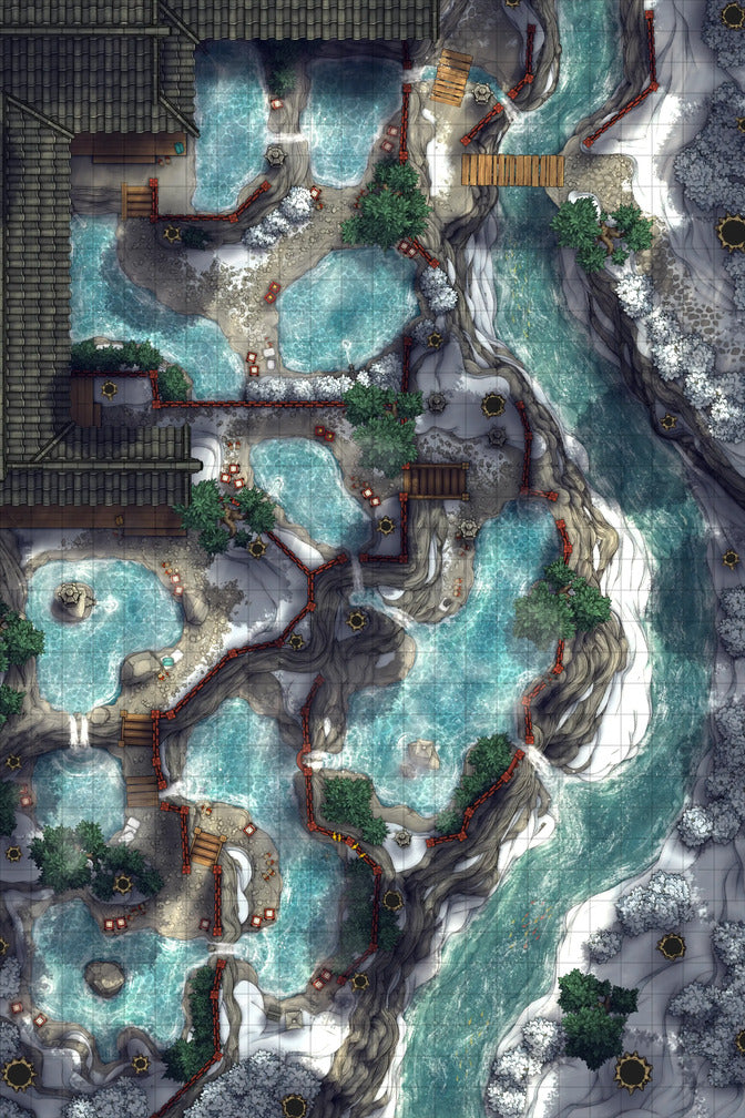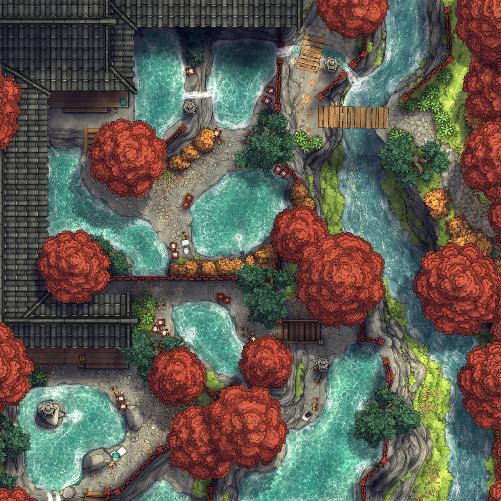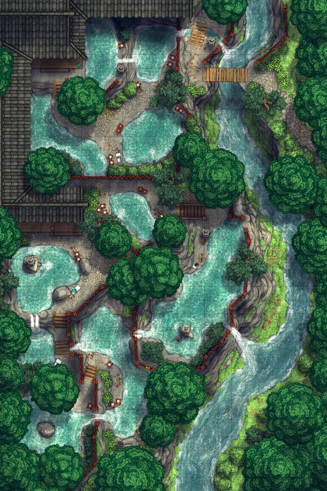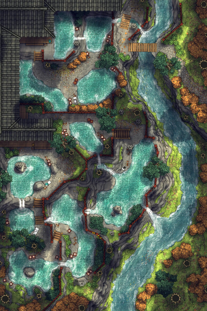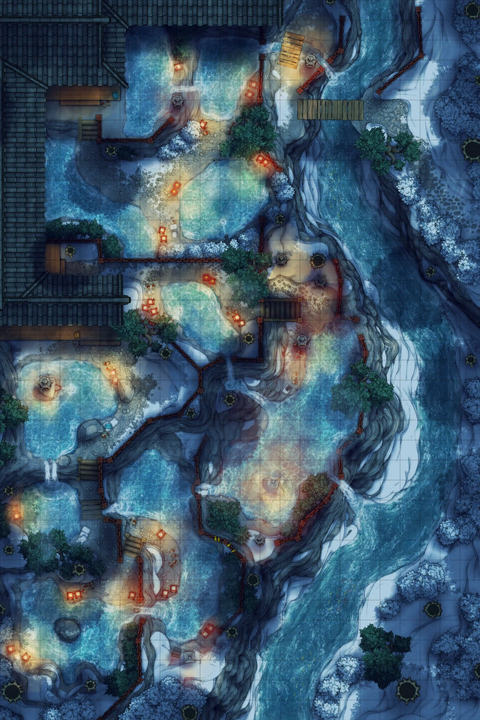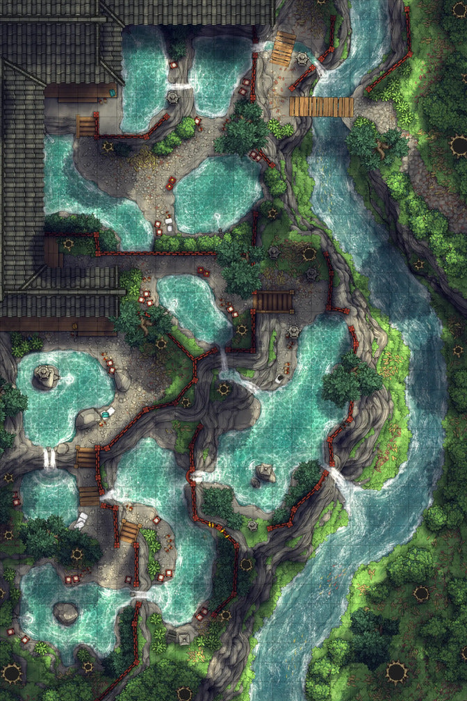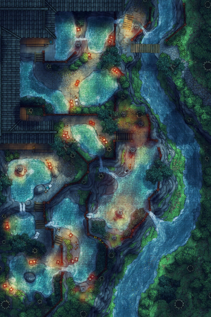 A relaxing mountainside bathhouse battlemap full of narrow winding passages, rocks, pools & carefully-maintained shrubbery for someone to make a mess out of! Alternatives feature a bizarre basalt underworld & a natural hot springs largely free from commercial intervention.