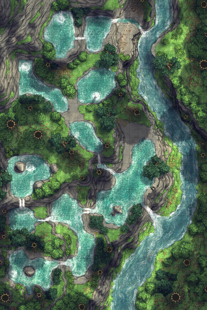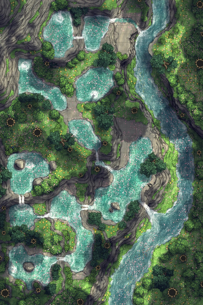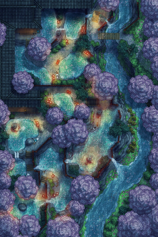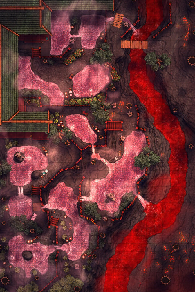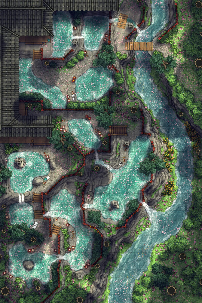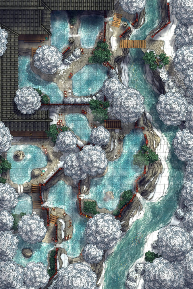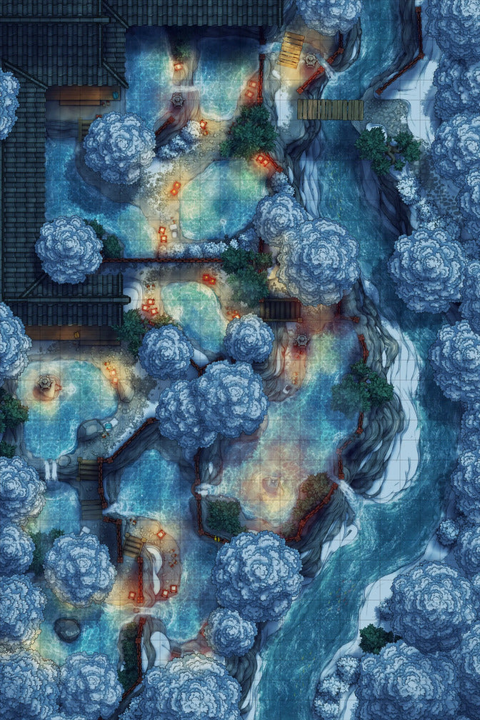 A relaxing mountainside bathhouse battlemap full of narrow winding passages, rocks, pools & carefully-maintained shrubbery for someone to make a mess out of! Alternatives feature a bizarre basalt underworld & a natural hot springs largely free from commercial intervention.