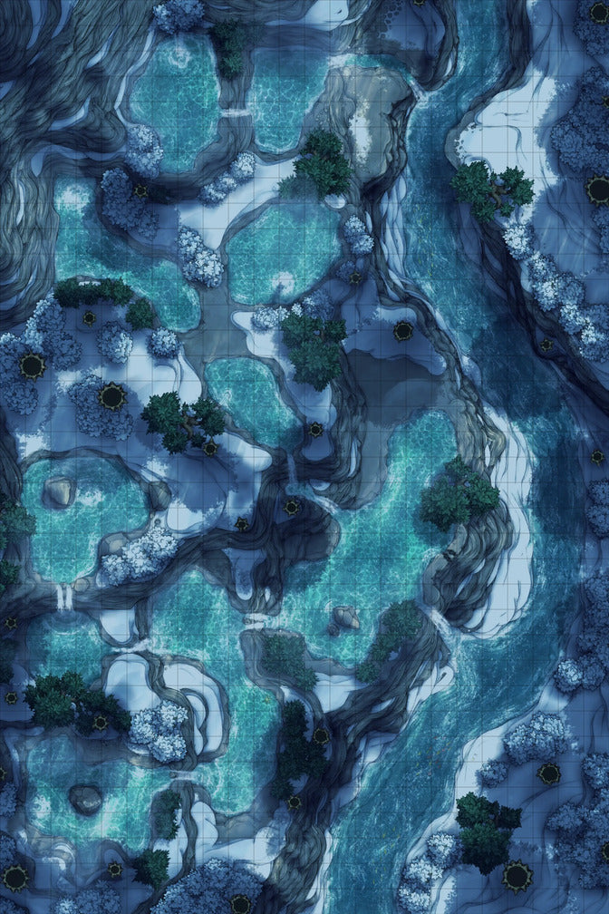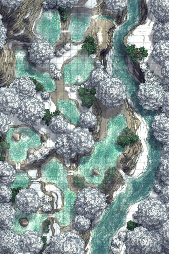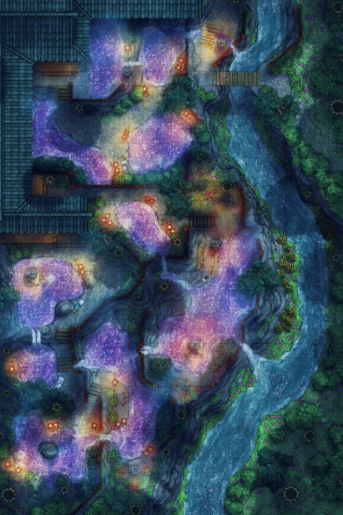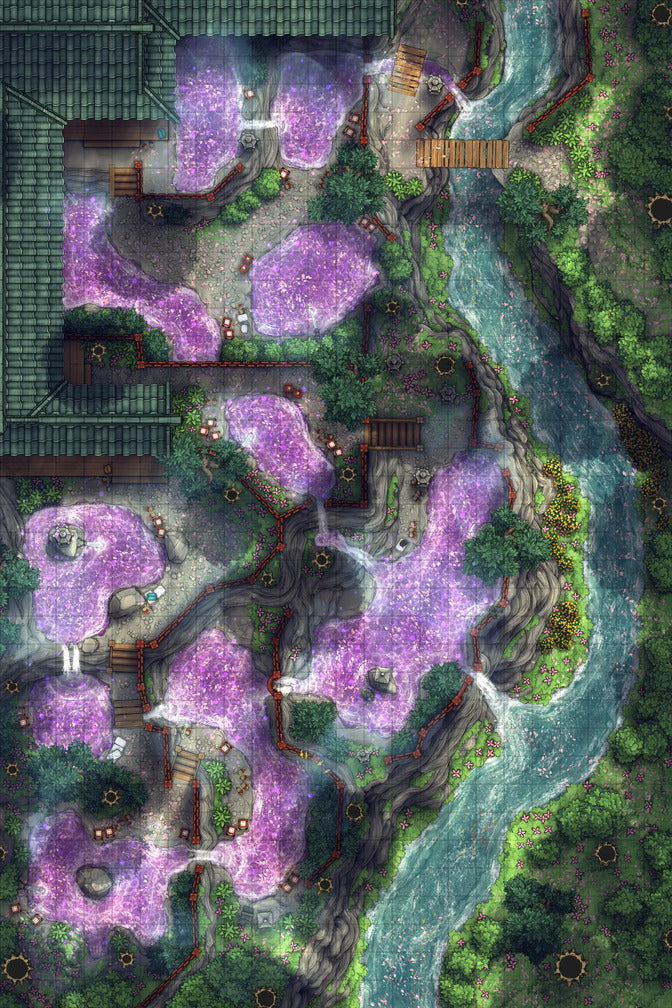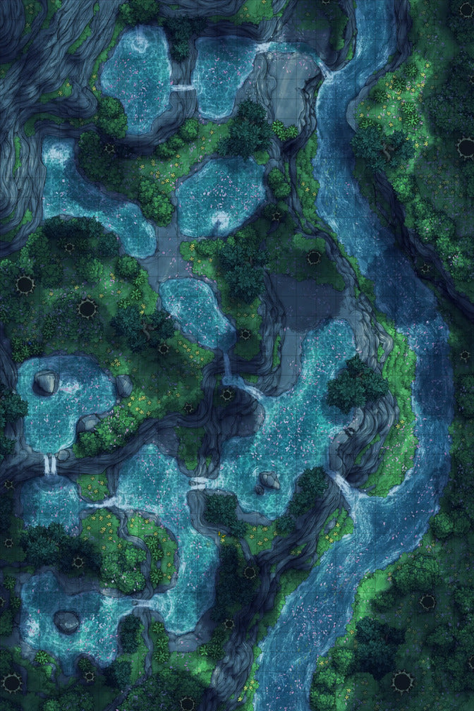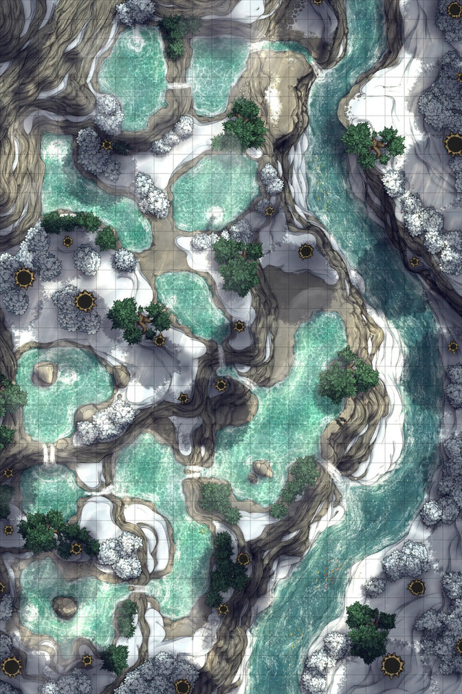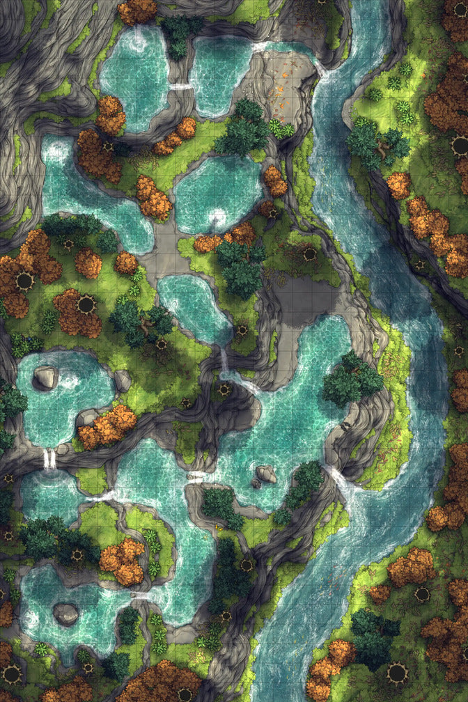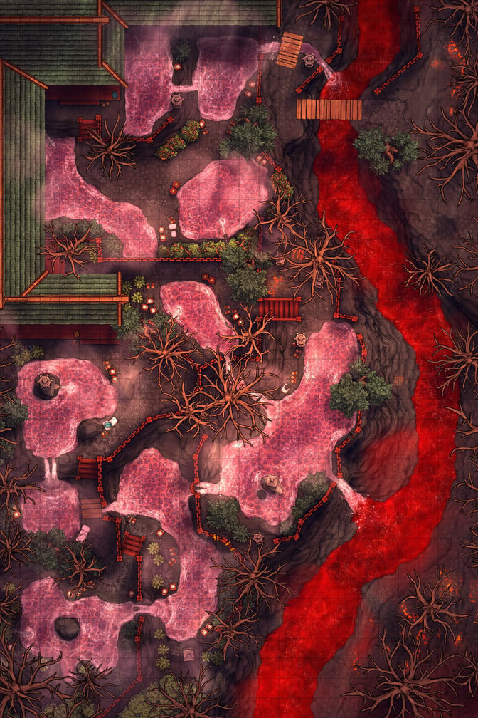 A relaxing mountainside bathhouse battlemap full of narrow winding passages, rocks, pools & carefully-maintained shrubbery for someone to make a mess out of! Alternatives feature a bizarre basalt underworld & a natural hot springs largely free from commercial intervention.