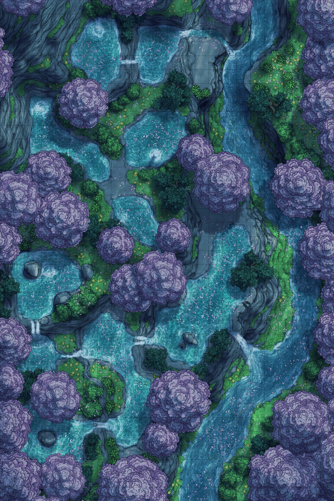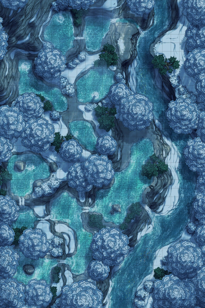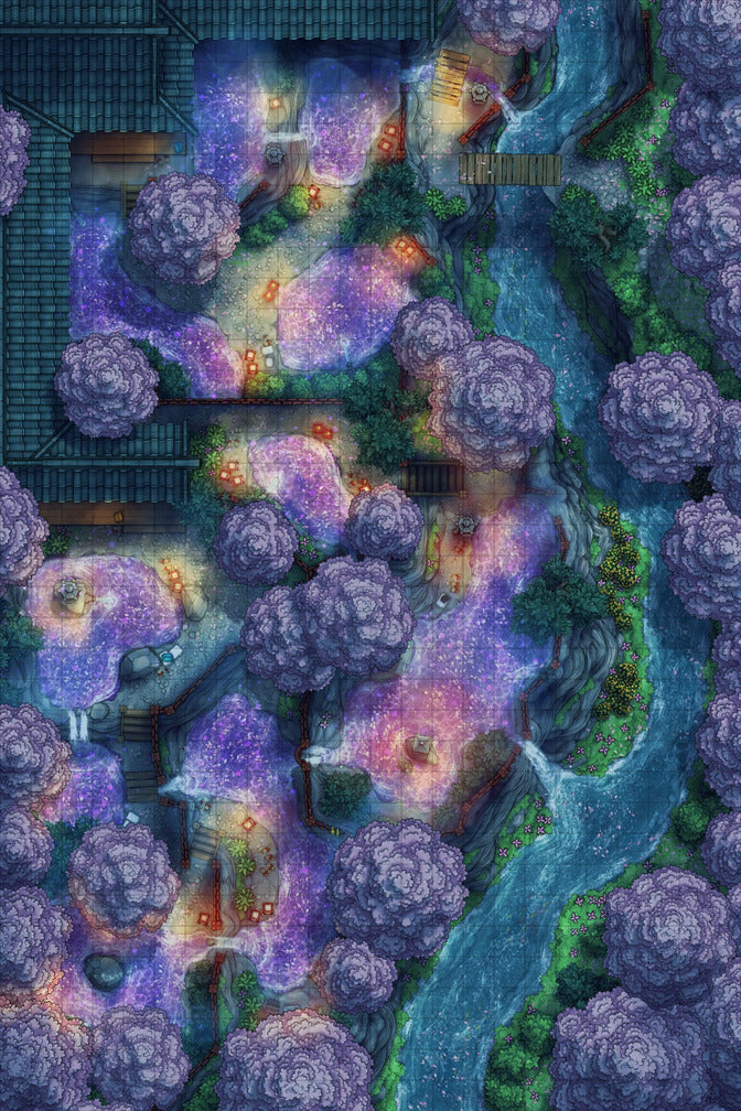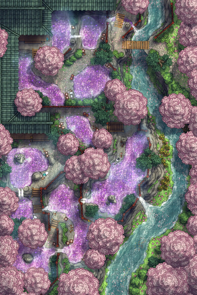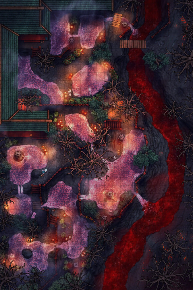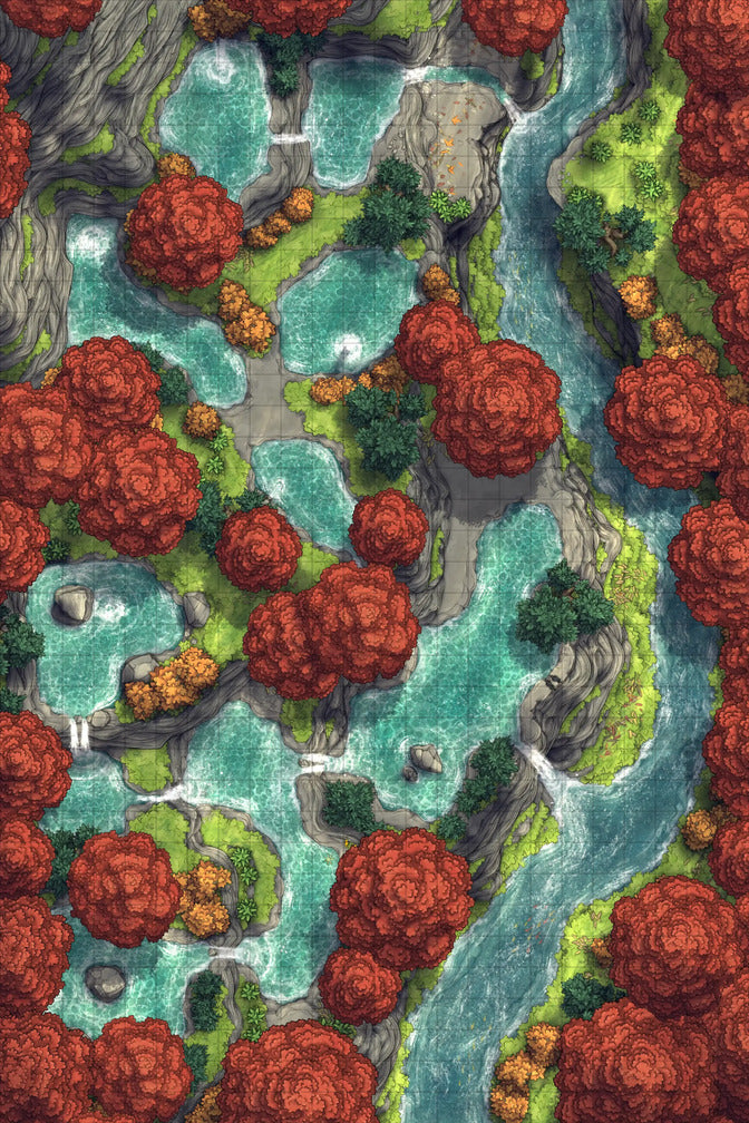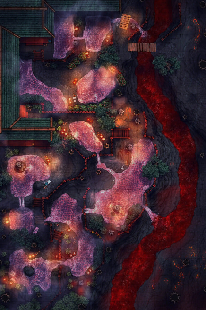 A relaxing mountainside bathhouse battlemap full of narrow winding passages, rocks, pools & carefully-maintained shrubbery for someone to make a mess out of! Alternatives feature a bizarre basalt underworld & a natural hot springs largely free from commercial intervention.