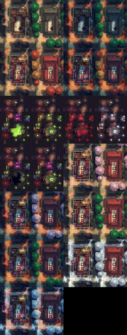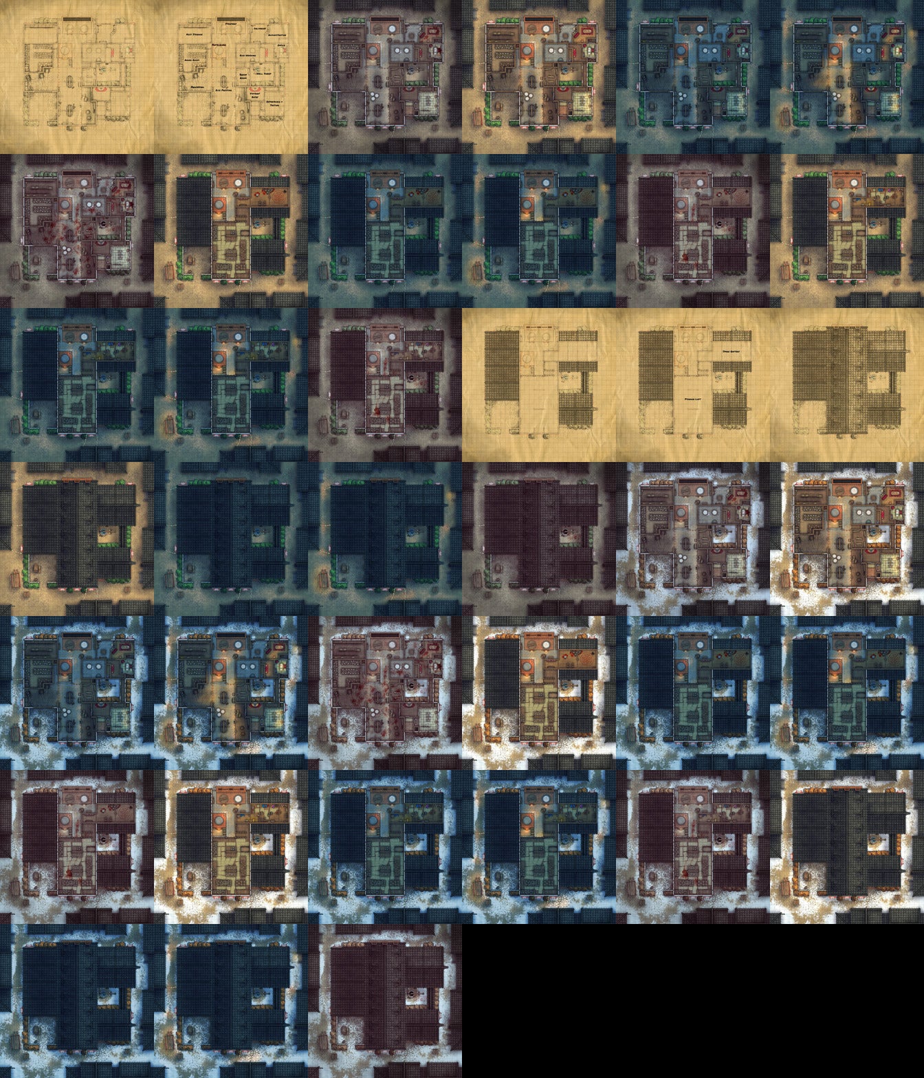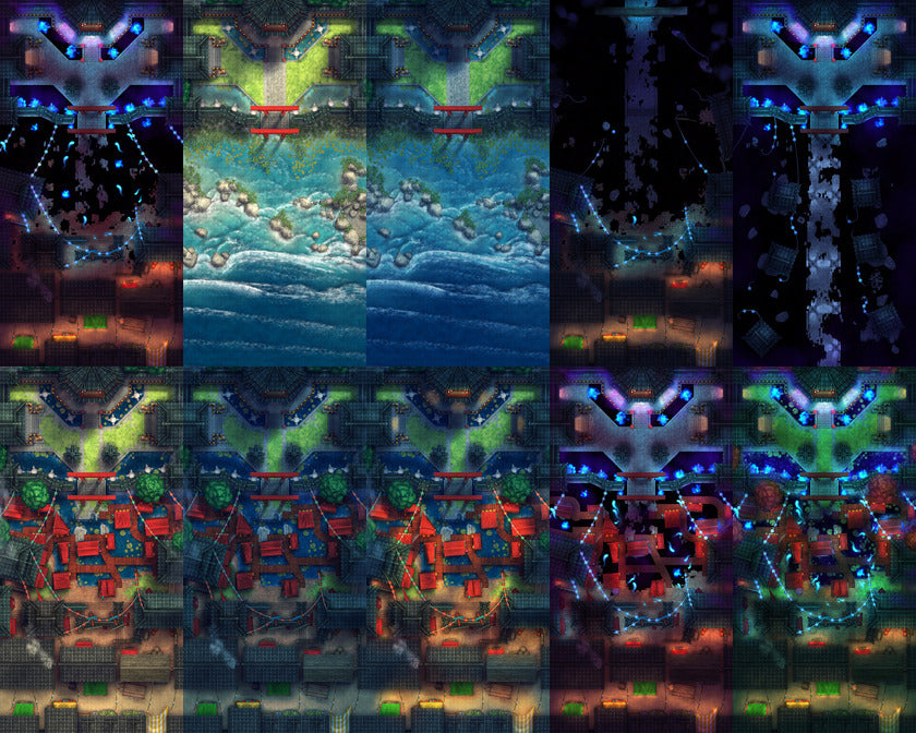 There's so much stuff here that it's difficult to write an actual description, but there's secret spirit world portals, plant-apocalypse districts, docks on fire, seafood markets, youkai manors, gang slums, gamblers' hideouts, & more, plus the street tiles needed for any ordinary street encounter or to interconnect several of the larger maps together into one massive map.